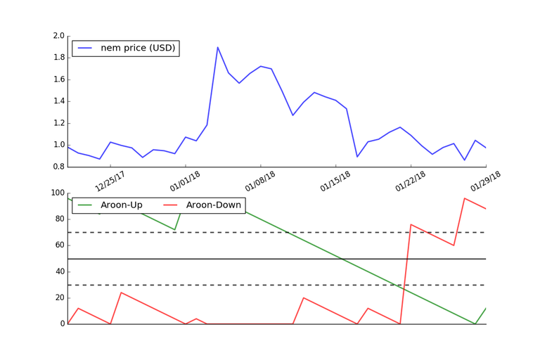 The graph below shows the Aroon Indicator using the price of Nem over the last 40 days.