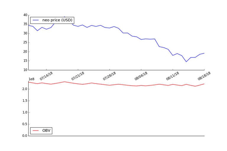 The graph below shows the OBV applied to the price of Neo using daily price data for the last 40 days.
