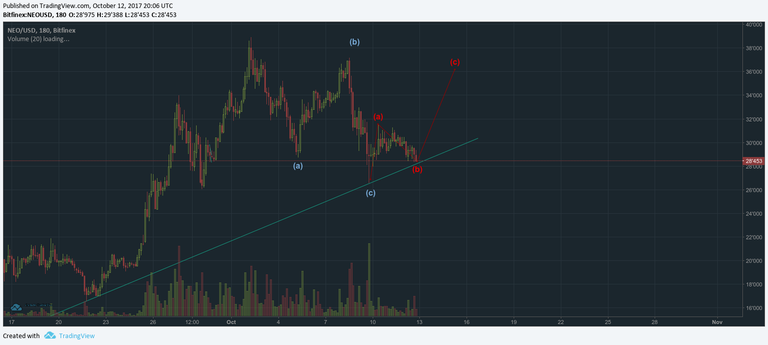 I was remembering this now old post, and I see NEO has hit the support trend line. So as an exercise I draw the last (a)(b)(c) so that (b) fits the new data. This would mean either a rebound on the support trend line o continuing down to the next support around 16, right?