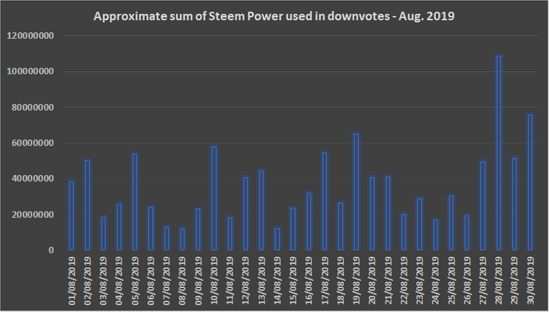 The table below shows the number of downvotes and total SP going into downvotes, using the weight of each vote and the SP owned by the voter.