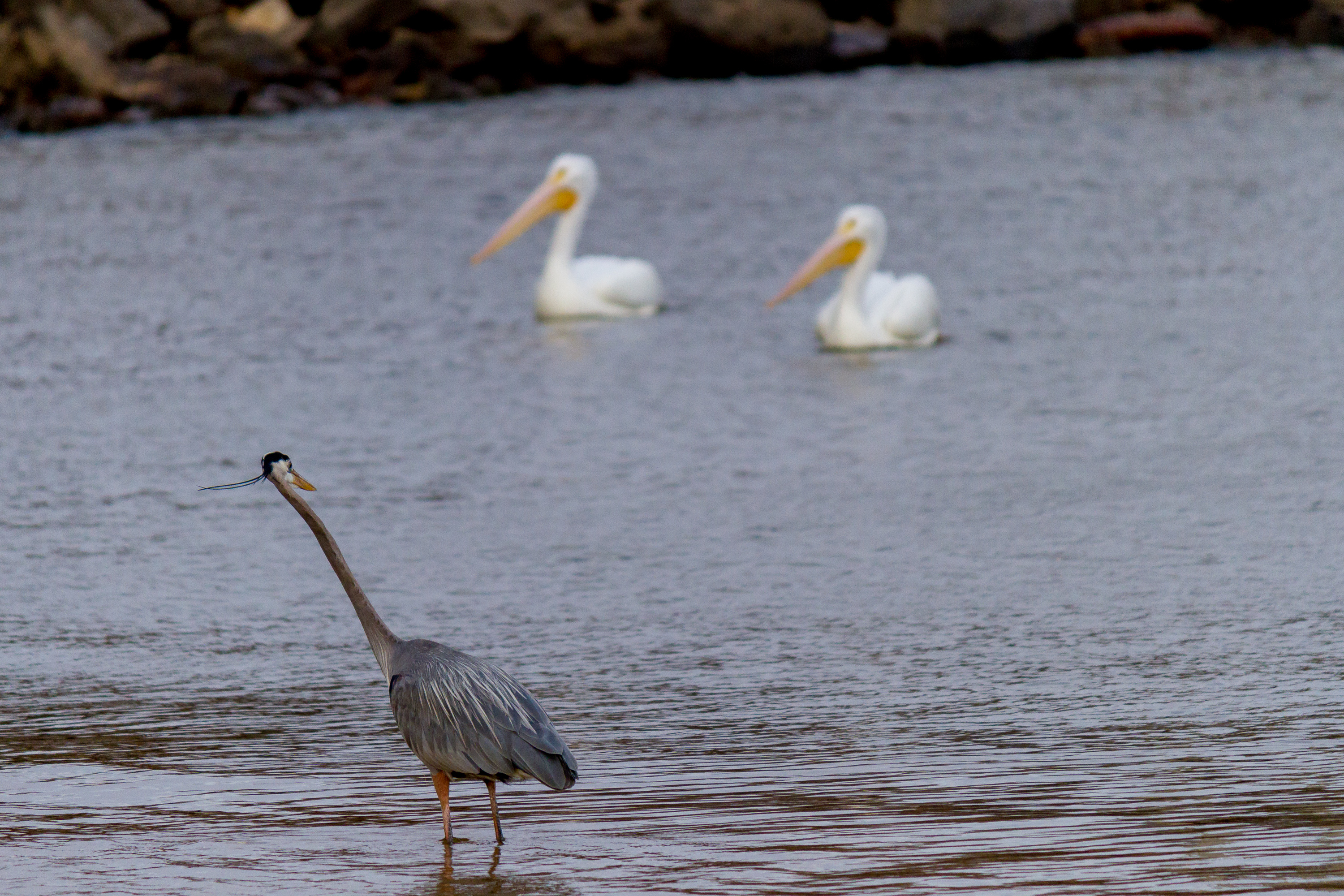 The blue heron was doing so well with the fish that some pelicans started to get closer to see what was up. I don't think Larry cared for them much.