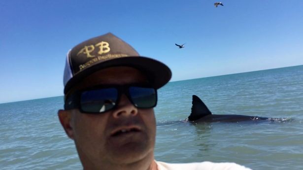 This citizen there (named Dale Péarson) noticed that there was a big animal (a white shark) near the beach of Cortez (Mexico). He and a friend found that the animal was stranded, when in fact it was only feeding of stingrays.