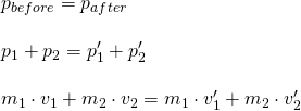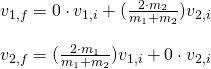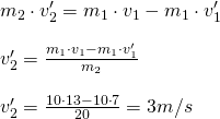 Knowing that the velocity of object 2 is zero at first, we can eliminate this component from the equation, and afterwards find the final velocity of the second object, by solving the equation for v2' and putting the given values for each quantity: