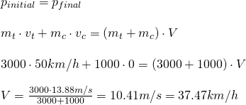Example from sciencenotesA 3000 kg truck travelling at 50 km/h strikes a stationary 1000 kg car, locking the two vehicles together.