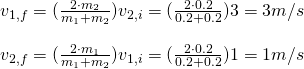 Based on an example from spiff.rit.eduLet's suppose that we have two balls of mass m = 0.2kg that move in the same direction. The ball in front is moving slower than the ball behind it and so the second ball catches up and hits it. If we know that the speed of each of them is v1 = 1 m/s and v2 = 3 m/s, what happens after they hit?