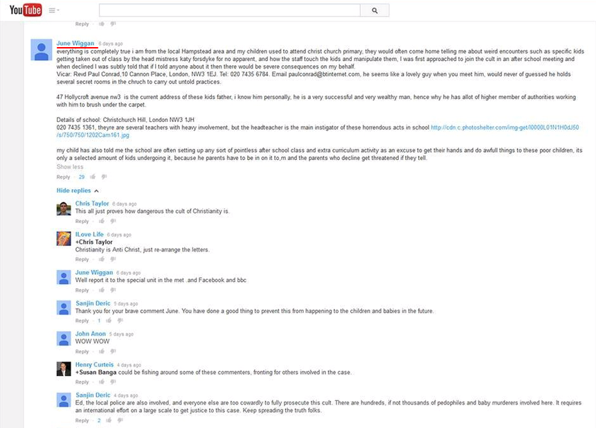 While on vacation in Morocco in August/September 2014, two siblings aged 8 and 9 from Hampstead, London revealed to their mother and her new partner that they along with 18 other children had been sexually and physically abused by their father and their teachers at school and in church. They described their father as the local leader of an international cult dealing in child trafficking, ritual murder and the production of child abuse material.