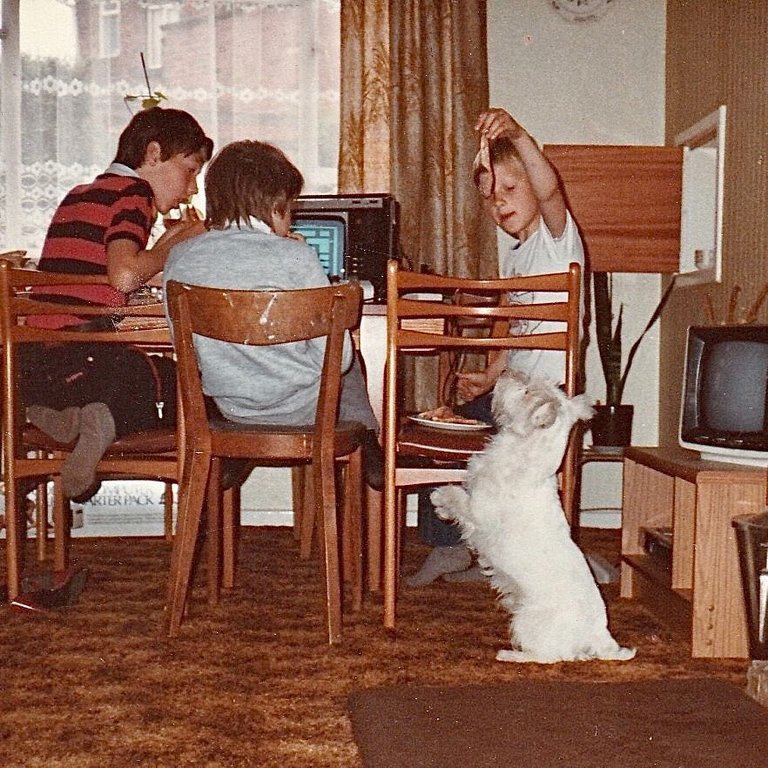 My first experience of any computer programming was when my cousin, Ian, brought his computer around on a visit. It was probably Easter 1983. You can see us here, Jay, Ian and me on the right feeding my bacon sandwich to our dog, Patch.