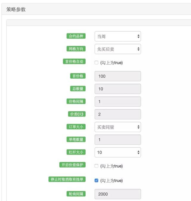 截图大致如上,由于期货合约的交易跟现货网格不一样,它只能开单边,再根据交易后进行反向交易。比如我设定的开始价格为 10000 美元,格子为 10 个,每个间隔 1000 美元,它就会从 10000 往下依次递减 1000 来布置。