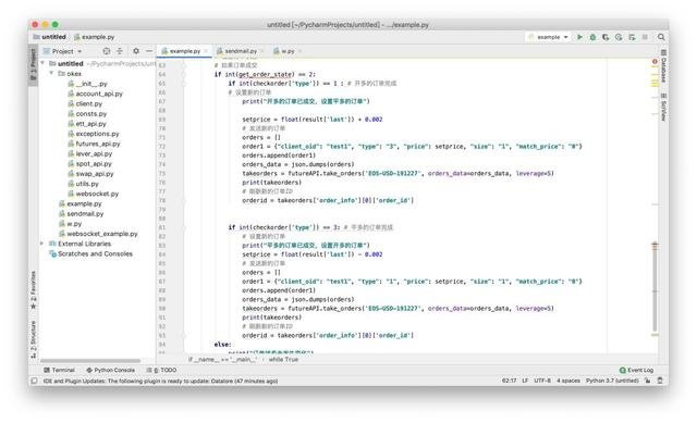 可以看到,console 里有输出币价相关信息,说明没问题。这里注意一下,我在最新的视频里也有讲到,由于国内无法正常访问 OKEX 官网,需要将 API 请求的网址进行修改,文件为 consts.py 里将:API_URL 里的 .com 网址修改为 .me 的即可。