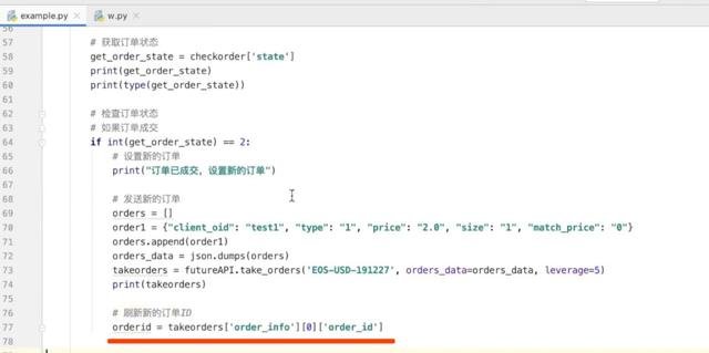 这里打印了下单的执行语句,因为下单后会返回订单的信息,其中包括了订单号。能拿到这段信息,就可以提取里面的订单号。通过我设置的变量,对应的方式就是: takeorders['order_info'][0]['order_id'],打印出来就会是对应的 ID 了。