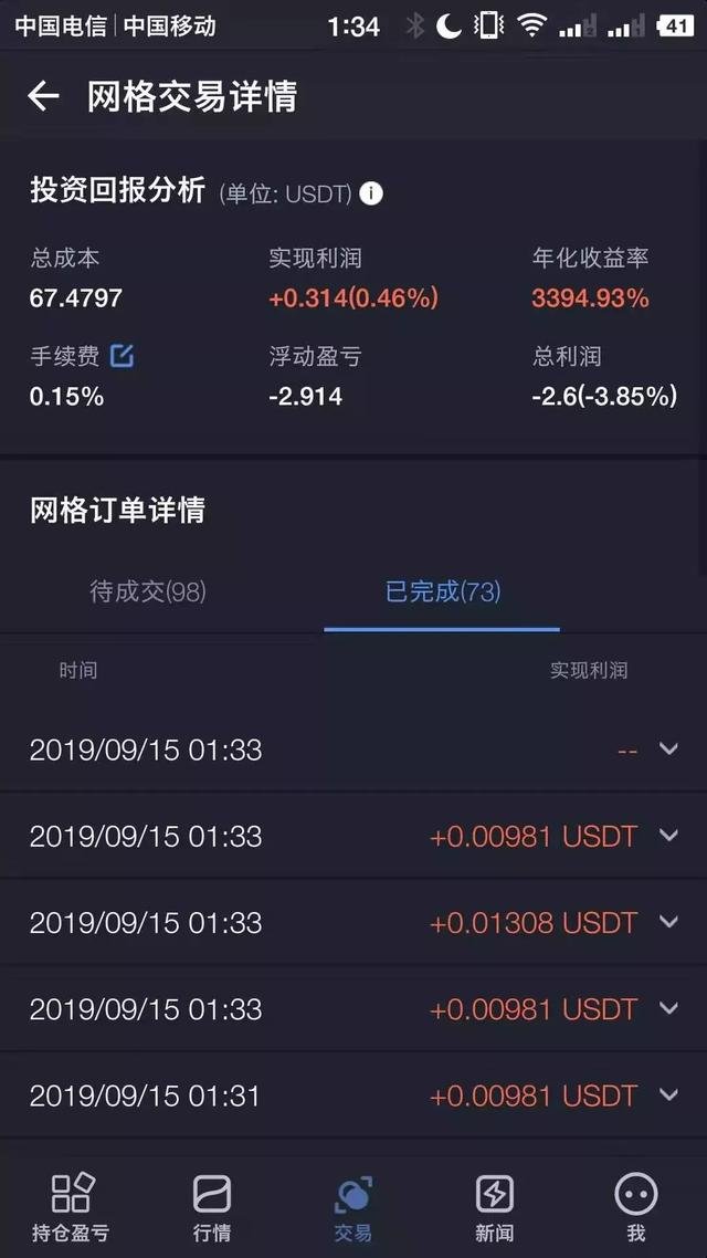 虽然网格交易也算是机器人交易的一种,但跟高频还是有大差距的。这也是为什么很多人觉得为什么跑了一天没有赚到钱的感觉。因为网格交易的原理是将投入的资金或者币种按格子数量整除,再拿去跑利润。相当于别人拿 1 个比特币做交易,1 次交易可以收获几百几千美金,而网格交易是拿1个比特币除以网格数量再去做交易,前者走的是质,后者靠的是量。所以做网格交易,最好祈祷交易对持续在震荡,不跑出格子,这样子时间越久,自然利润也会越来越多。