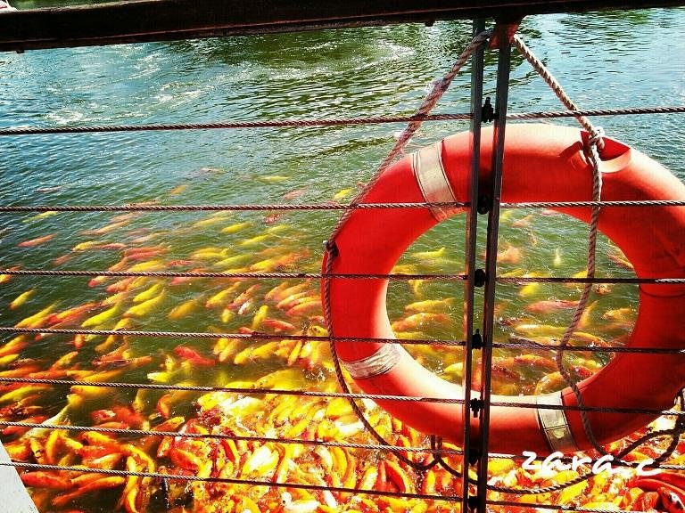 Photo of the koi fishes and an orange lifebuoy