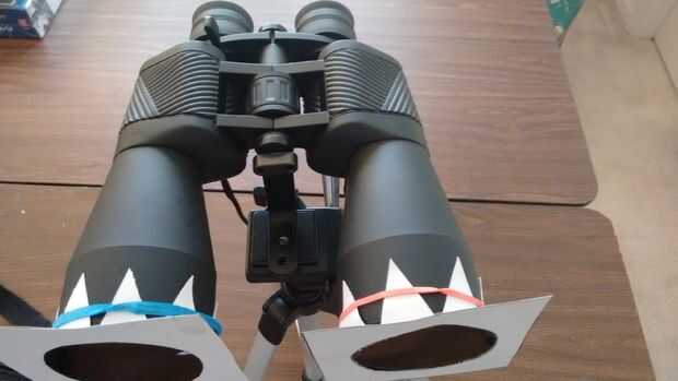 -With your back to the sun, hold the binoculars with one hand and point them towards the eclipse so that the lens discovered captures the eclipse. Use the shadow of the binoculars to help you align them.