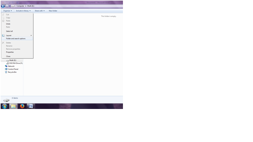 1.Click on the 'Organize' menu and select 'Folder and search options'