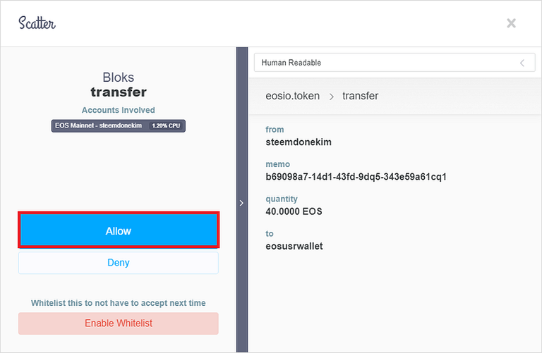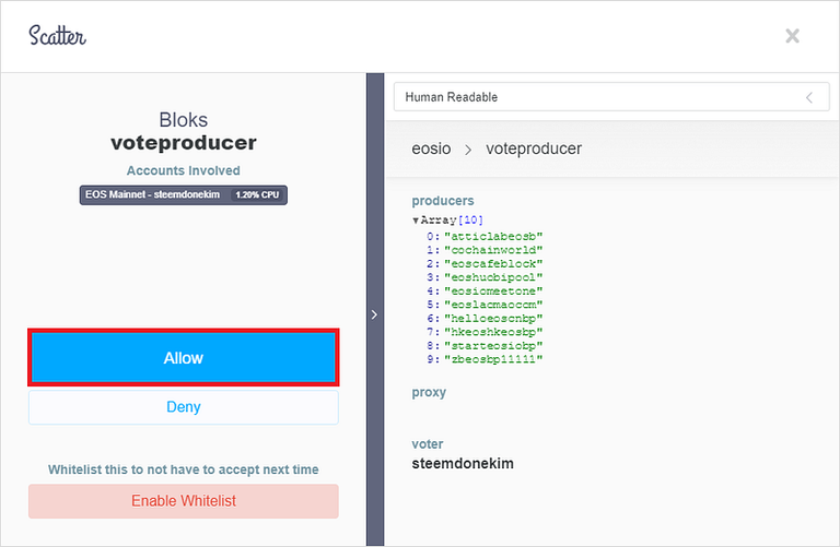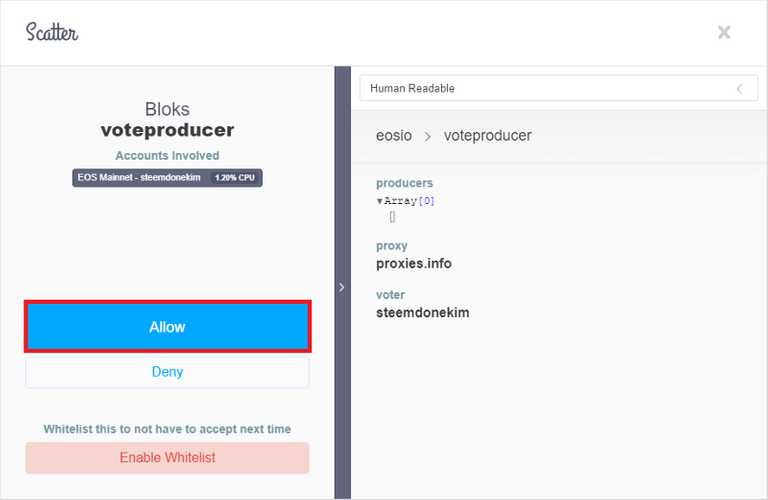 ④ 위와 같이 스캐터 팝업창이 나타나면 [Allow] 버튼을 클릭해주세요. 여기까지 하시면 투표참여가 완료된 것입니다.