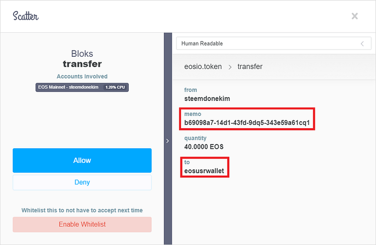 ② 스캐터 팝업창이 나타나면 다시 한 번 입금계정주소(12자리)와 메모가 정확한지를 확인해주세요