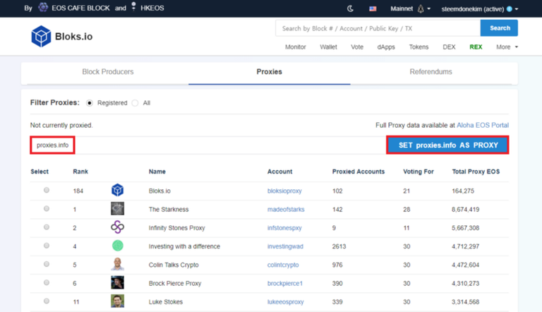 아래의 설명은 제가 운영 중인 프록시 계정에 투표권을 위임해주시는 방법입니다. 제 프록시 계정에서는 이번에 제네시스 계정 키 분실자들을 위한 복구솔루션 개발 및 커뮤니티 서포트에 참여한 BP들(EOS Authority, EOS DAC, EOS Nation, Liberty Block, EOS42)은 모두 포함이 되어 있으며, 그 외에는 EOS메인넷 관련 툴킷, 월렛 등의 서비스를 개발하였거나 커뮤니티를 위한 교육자료를 주기적으로 제공하는 BP, 그리고 거버넌스 활동에 적극참여하거나 풀노드를 운영하는 BP들이 포함되어 있습니다.