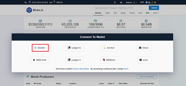 ⑤ 위에서 계정이 제대로 연결되는 것이 확인되었다면, 이오스 메인넷의 지갑 사이트( https://bloks.io)에 접속해주세요.