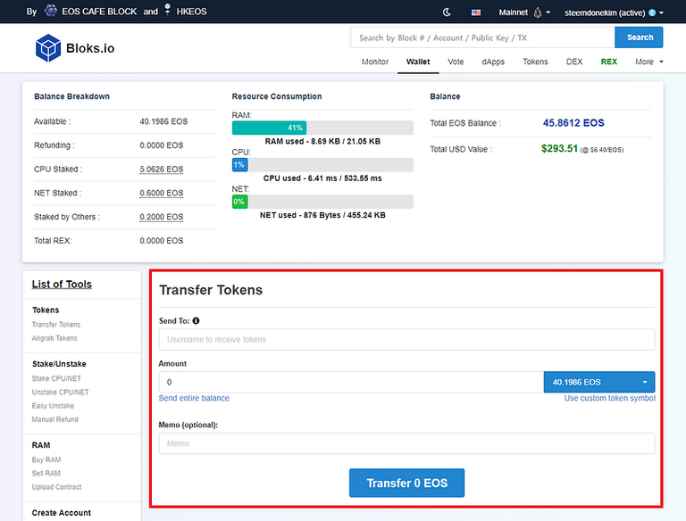 ① https://bloks.io/wallet 에 접속하시면 위와 같이 곧바로 토큰 전송 메뉴가 나옵니다
