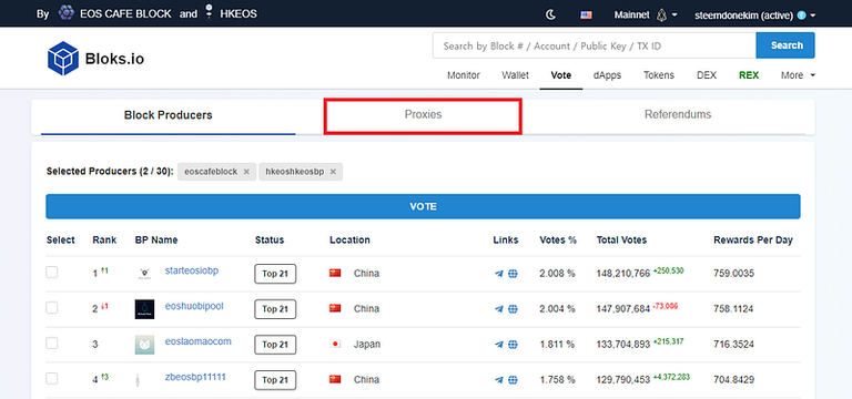 방금 전에 접속했던 사이트(https://bloks.io)에서 [Vote]탭을 클릭해주세요