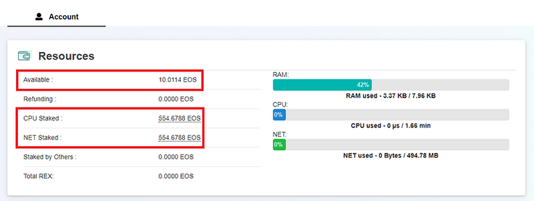 현재 여러분들의 계정은 위와 같이 약 10개의 EOS를 제외하고는 모두 스테이킹이 되어 있는 상태입니다. 예를 들어서 내 계정에 910개의 EOS를 보유 중이었다면, 10개만 즉시 전송이 가능한 상태이고 나머지 900개는 각각 CPU에 450개, NET에 450개가 자동으로 스테이킹이 되어 있기 때문에 언스테이킹을 신청하시고 3일(72시간)이 지나야만 전송 가능한 상태로 바뀌게 됩니다.