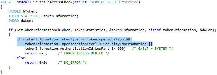 After MS15-050 Patch: The Impersonation Level is now correctly verified before the SYSTEM check.
