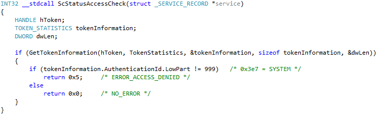 Before MS15-050 Patch: The calling thread's Token is checked to see if it is run as SYSTEM, or LUID 999.