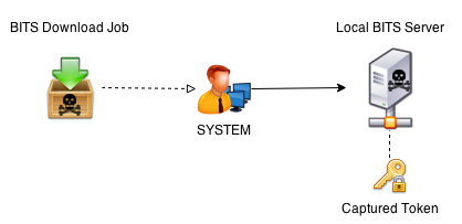 Forcing a BITS download to an attacker-controlled BITS server allows capture of a SYSTEM token.