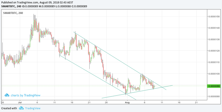 As you can see below, we have a beautiful pattern forming in the 4H chart. Price is going to break one way or another in the next 48 hours. If it breaks to the upside, it can easily rally up to 1300 sats at least. If it breaks to the downside, it will most likely see 550 sats.