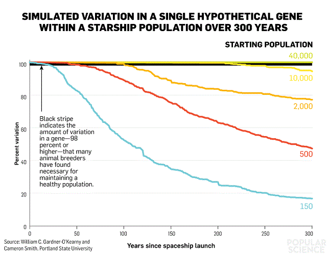 The number of colonists needed to keep the population genetically healthy has been estimated from 160 (if they mix their genes with 10 other people) to 40,000 – with 10,000 being a satisfactory amount.