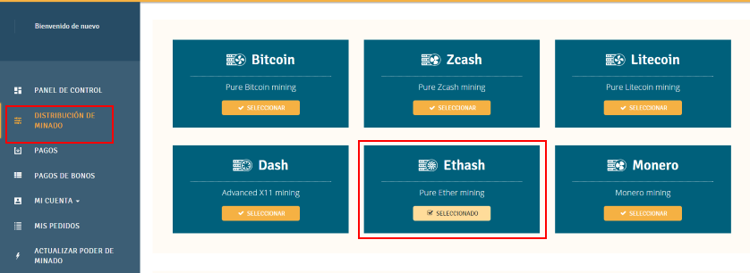 Dentro de esta sección elige la opción de Ethash para entrar al panel de configuración de minado correspondiente.