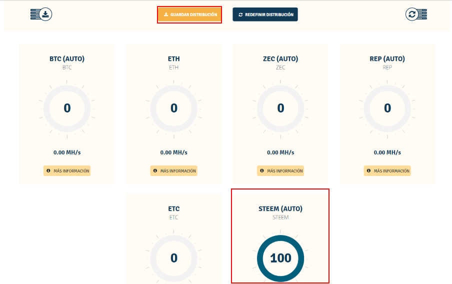 Al adquirir este contrato, estarás rentando por 2 años una potencia de 1 MH/s para minar Ethereum. La para cambiar esa potencia para minar STEEM esta en ir a la sección de Distribución de Minado.