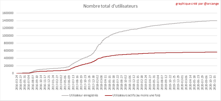 Ce graphique montre le nombre d'utilisateurs nouvellement inscrits sur la blockchain et combien d'entre eux sont devenus actifs. Nous voyons que beaucoup de comptes sont enregistrés, mais jamais utilisés. Ce graphique est un peu dynamique! Un utilisateur peut s'inscrire un jour et ne devenir actif que quelques jours plus tard. Par conséquent, le nombre d'utilisateurs actifs à une date donnée peut varier d'un jour à l'autre.