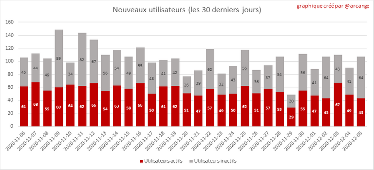 La partie grise de chaque colonne indique le nombre de comptes inactifs (ceux qui n'ont plus publié, commenté ou voté depuis 30 jours).
