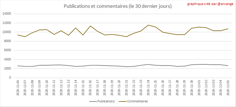 Ces graphiques montrent l'évolution des publications et des commentaires pour toute la durée de vie de la blockchain et pour les 30 derniers jours.