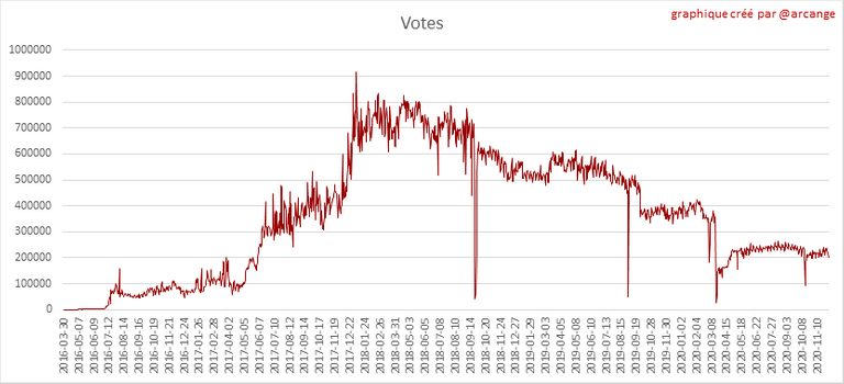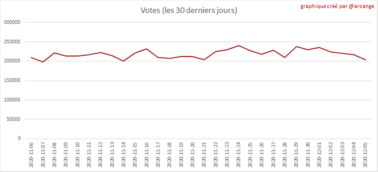 Ces graphiques montrent l'évolution de la curation (votes positifs) depuis la création de la blockchain et pour les 30 derniers jours.