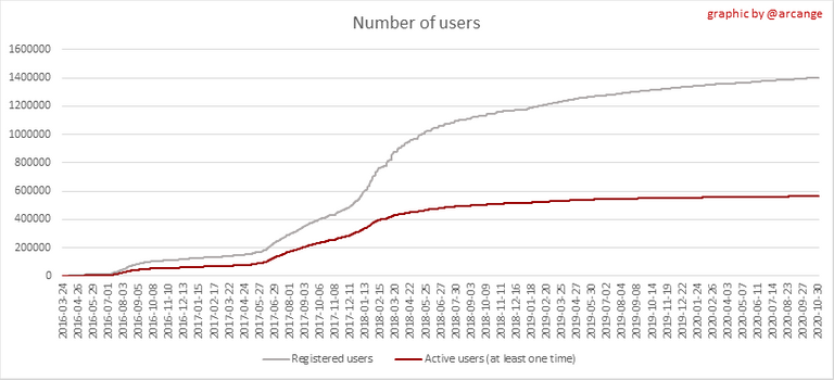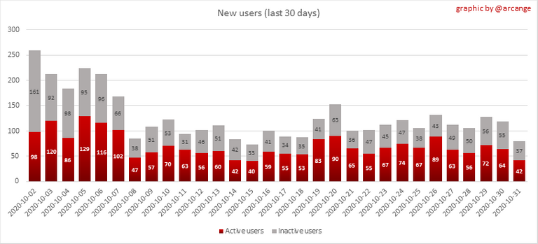 These two graphs show who created new accounts during the last day and the total number of registered accounts. The red line shows how many of them have been active at least once (active meaning publishing a post, commenting or voting). They are included even if they become inactive later.