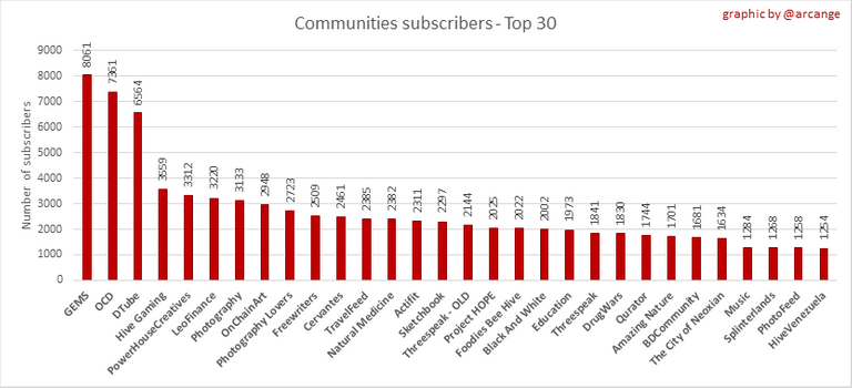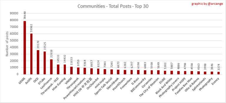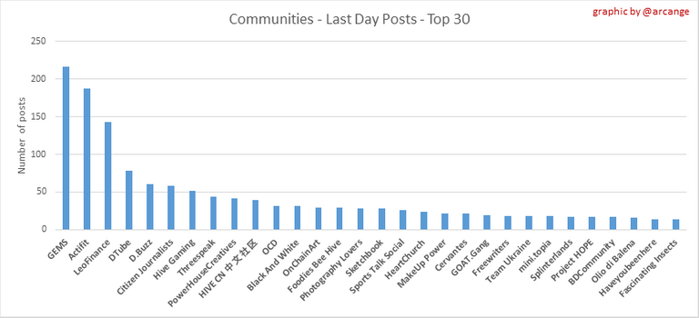 These graphs show the most active communities by number of posts (blockchain lifetime and last day).