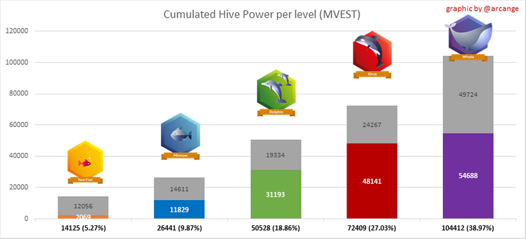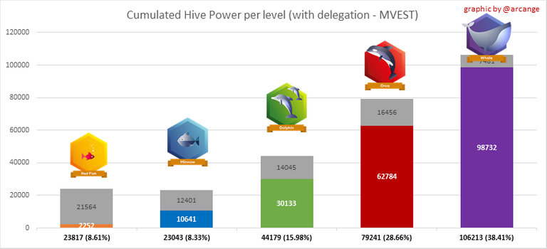This graph shows the distribution of Hive Power cumulated per account level. The left graph shows the distribution without taking into account any delegation made or received by the accounts. The right graphs take into account delegation, adds received HP delegation and subtracts given HP delegation.