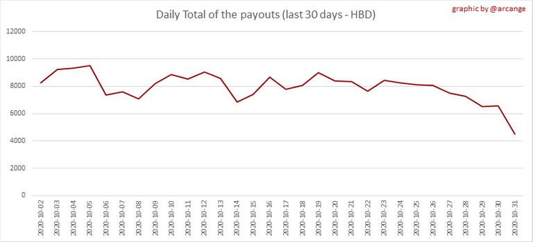 These graphs show the total of the distributed payout (posts and comments) for each day.