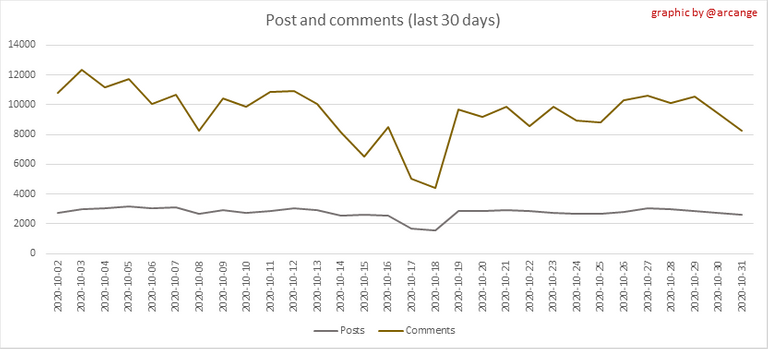 These graphs show the evolution of posts and comments for the whole blockchain lifetime and for the last 30 days.