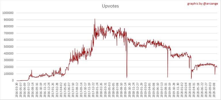 These graphs show the evolution of curation (upvotes) for the whole blockchain lifetime and for the last 30 days.