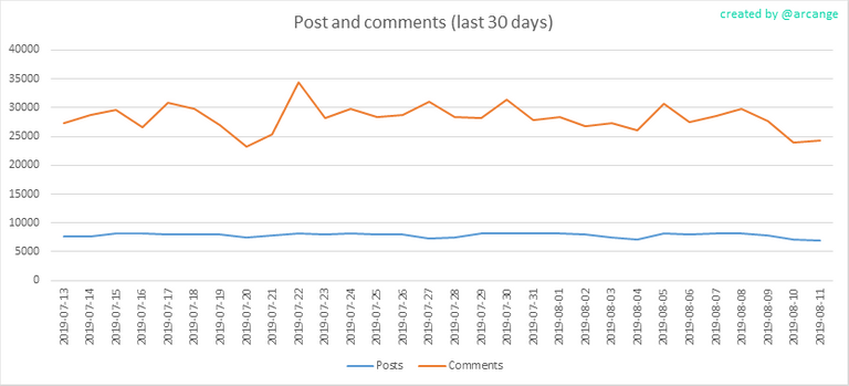 These graphs show the evolution of posts and comments for the whole blockchain lifetime and for the last 30 days.