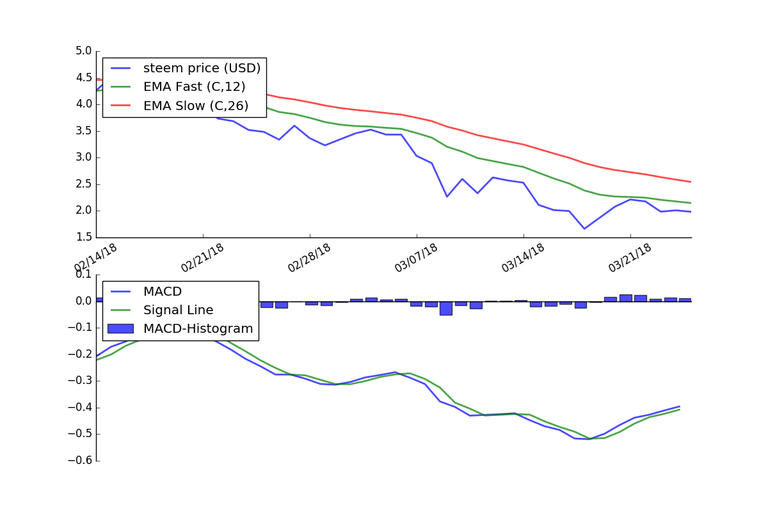The graph below shows the MACD applied to the price of Steem using daily price data for the last 40 days.