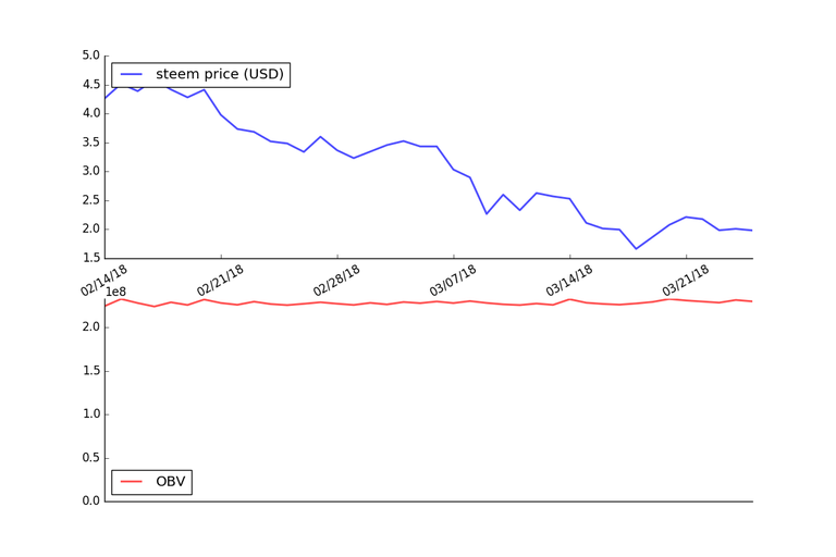 The graph below shows the OBV applied to the price of Steem using daily price data for the last 40 days.