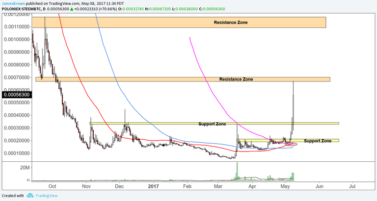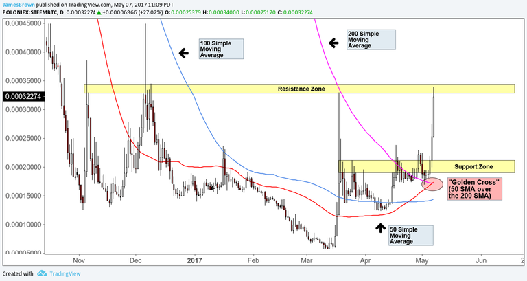 A major bullish signal happened today on the daily STEEM/BTC chart, one of the strongest bullish signals known to the market - a "golden cross" of the 50 simple moving average (SMA) over the 200 SMA. Of course, this is no guarantee that price will continue to climb and climb from here, but it is a statistically dependable indicator that the "momentum" of the market has turned to the upside.