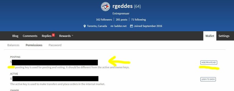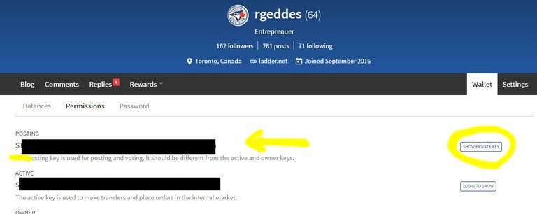 You will see a series of keys - the first one is or the "Posting Key" which is what you want. It will start with the letter "S" if it is showing the public key (as underlined in yellow). Click on the box circled in yellow that says "Show Private Key".