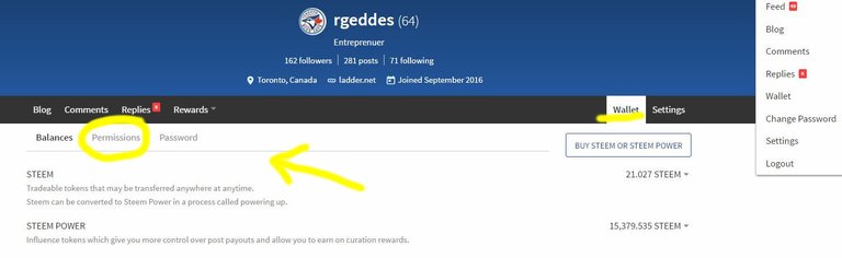 Make sure you are on the Wallet tab - you will see in the image below that it is underlined in Yellow. Circled in yellow with an arrow pointing to it is the Permissions link. Click on this link.