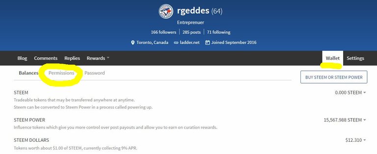 Your wallet should look similar to the below. There is a link that says "Permissions" (the one circled in yellow) - click on the link.