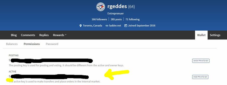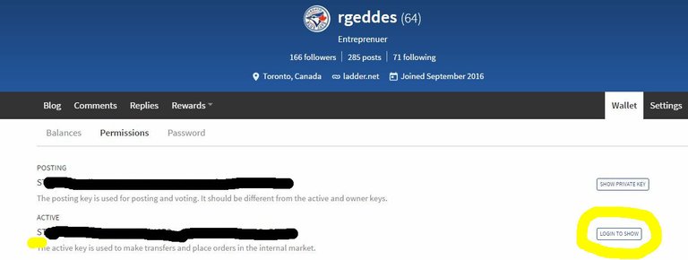 The second key down is your Active Key. When you first arrive at the page it will show you the public key (Starts with the letter "S"). Click on the box cicled in yellow to login and get the private active key.